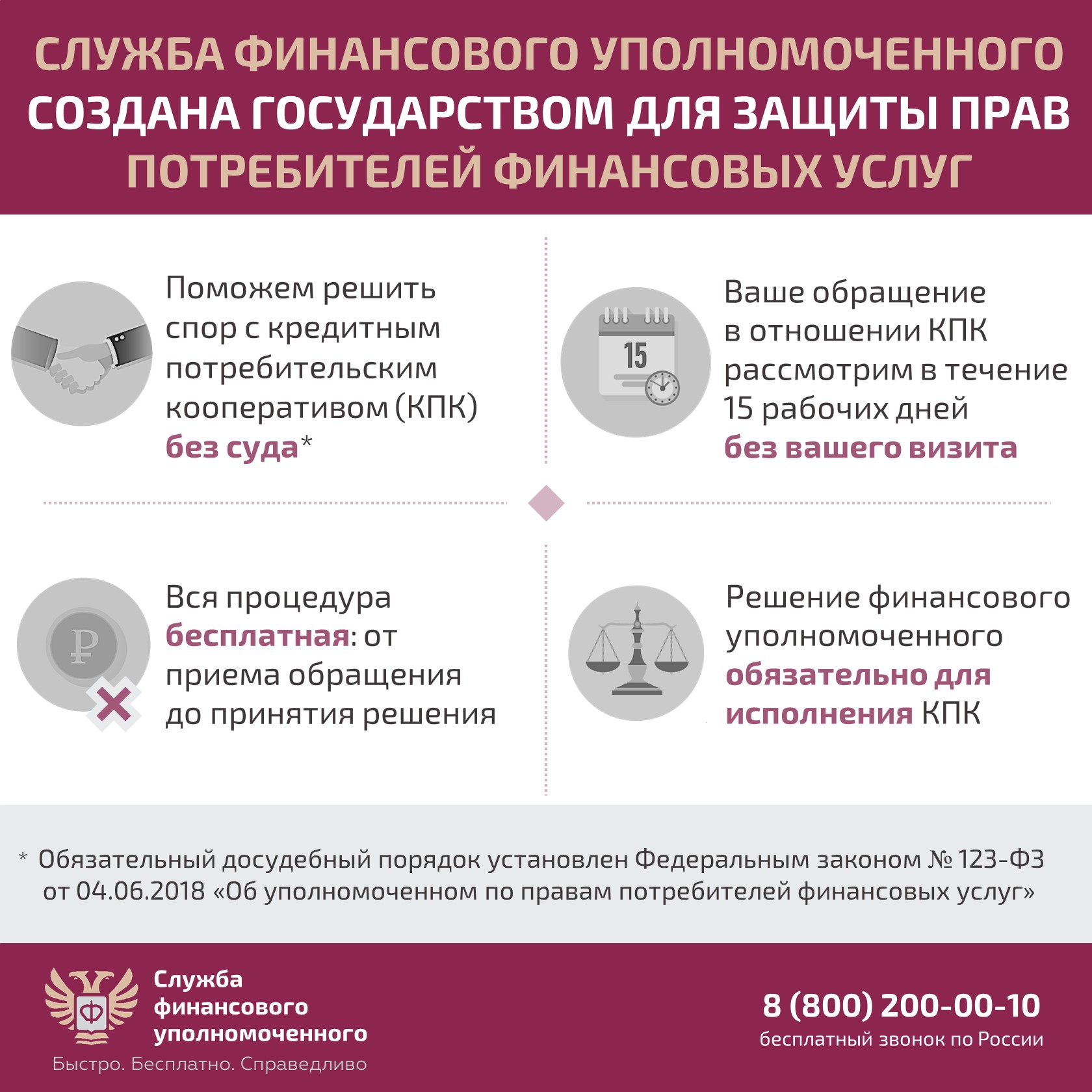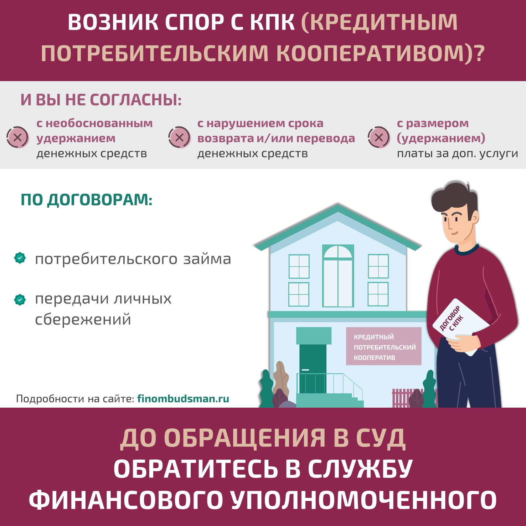 Вы не согласны с необоснованным удержанием денежных средств или с начисленными процентами в рамках договора передачи личных сбережений? Считаете, что КПК нарушил срок возврата вам денежных средств? Или в рамках договора потребительского займа вам отказали в возврате удержанных комиссий или платы за дополнительные услуги? Для решения спора с КПК без суда обратитесь к финансовому уполномоченному. Он бесплатно рассматривает в досудебном порядке обращения клиентов КПК – физических лиц, содержащие денежные требования в размере не более 500 тысяч рублей. В 2024 году в Службу финансового уполномоченного поступило 142 обращения по спорам с 51 кредитным потребительским кооперативом. Средний размер требований потребителей по спорам с КПК в 2024 году составил 345 тыс. рублей. Важно знать! Если ваш спор с КПК относится к компетенции финансового уполномоченного, то за защитой своих прав вы должны обратиться к финансовому уполномоченному до обращения в суд. Данный порядок установлен законом и является обязательным. Направить обращение финансовому уполномоченному можно через личный кабинет на сайте finombudsman.ru или через любой МФЦ Орловской области.